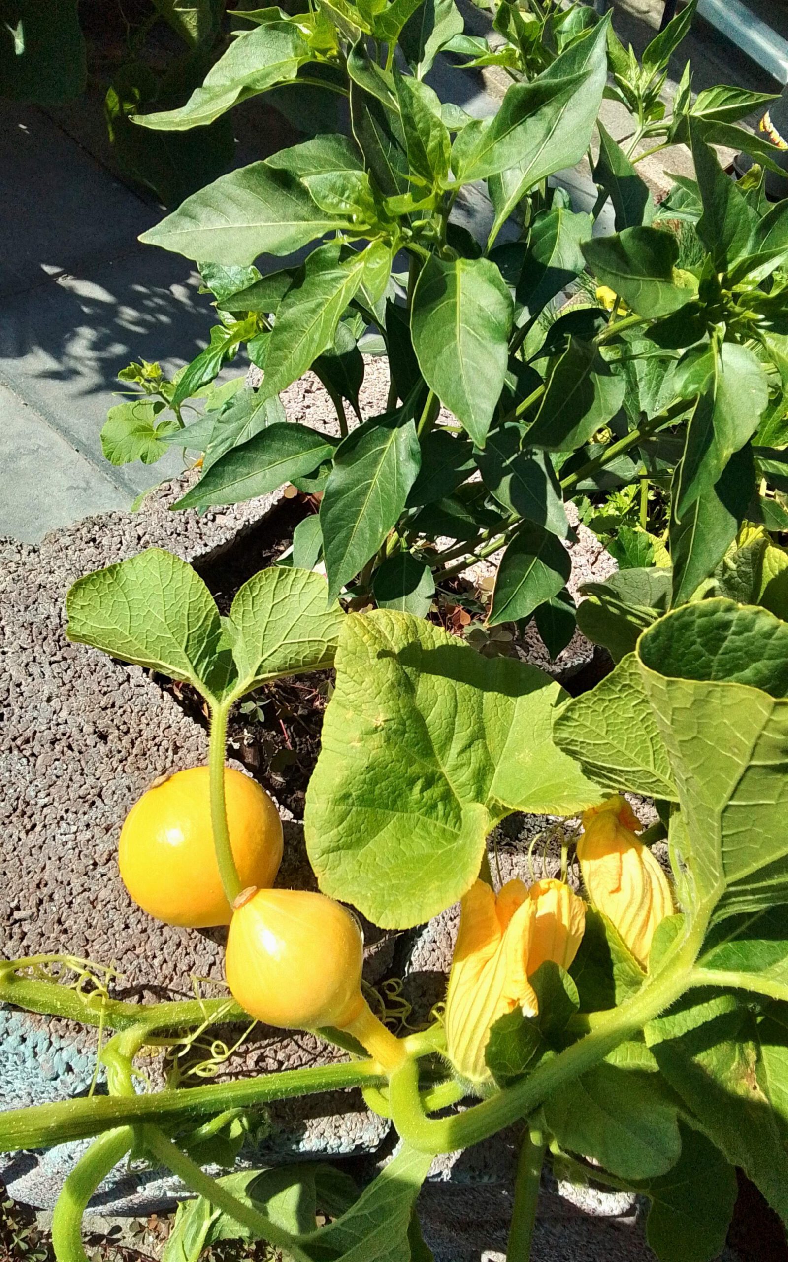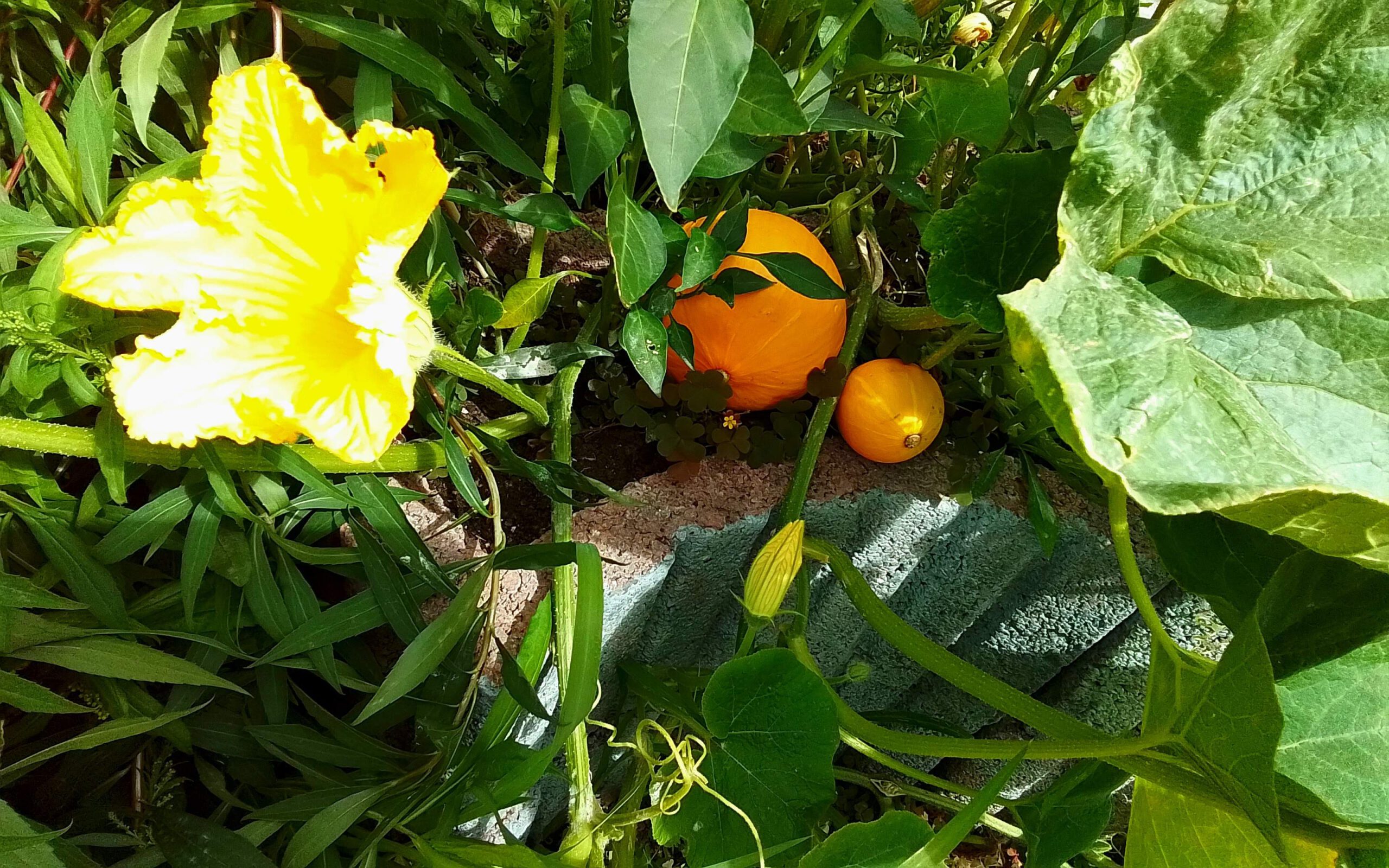 Once settled in the garden, vines begin to spread quickly. Large green leaves develop, followed by bright yellow flowers. When the flower opens and starts producing pollen, it is ready for pollination.